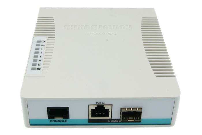 Smart Switch, 5x SFP cages, 1x Combo port (SFP or Gigabit Ethernet), 400MHz CPU, 128MB RAM, desktop case, RouterOS L5