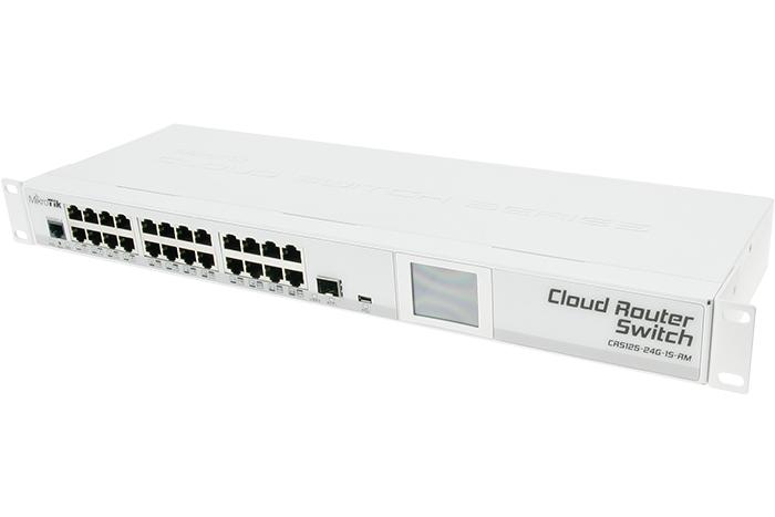 24x Gigabit Ethernet layer 3 Smart Switch, 1x SFP cage, LCD, 600MHz CPU, 128MB RAM, 1U rackmount, RouterOS L5