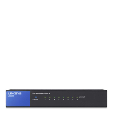 LINKSYS LGS108 8-PORT BUSINESS DESKTOP GIGABIT SWITCH Accelerate your performance and productivity when you send large files to network servers, drives, and printers at Gigabit speeds. Learn More Wired connection speed up to 1000 Mbps 8 Gigabit Ethernet auto-sensing ports Easy plug & play connection QoS Meets EEE (Energy Efficient Ethernet) 802.3az standard