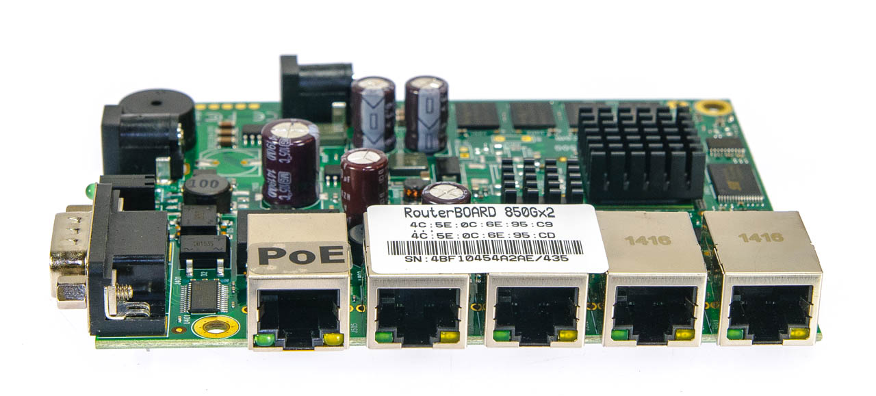 The RB850Gx2 is a five port Gigabit ethernet router. Comparing to the RB450G, the RB850Gx2 is much faster, with a dual core CPU, yet it still retains the same form factor, and will fit into the same enclosures.