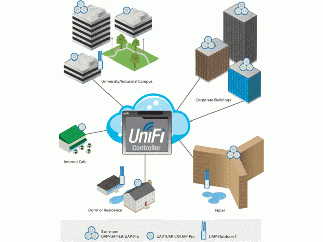 The UniFi® Controller software is a powerful, enterprise wireless software engine ideal for high-density client deployments requiring low latency and high uptime performance. A single UniFi Controller running in the cloud can manage multiple sites: multiple, distributed deployments and multi-tenancy for managed service providers.